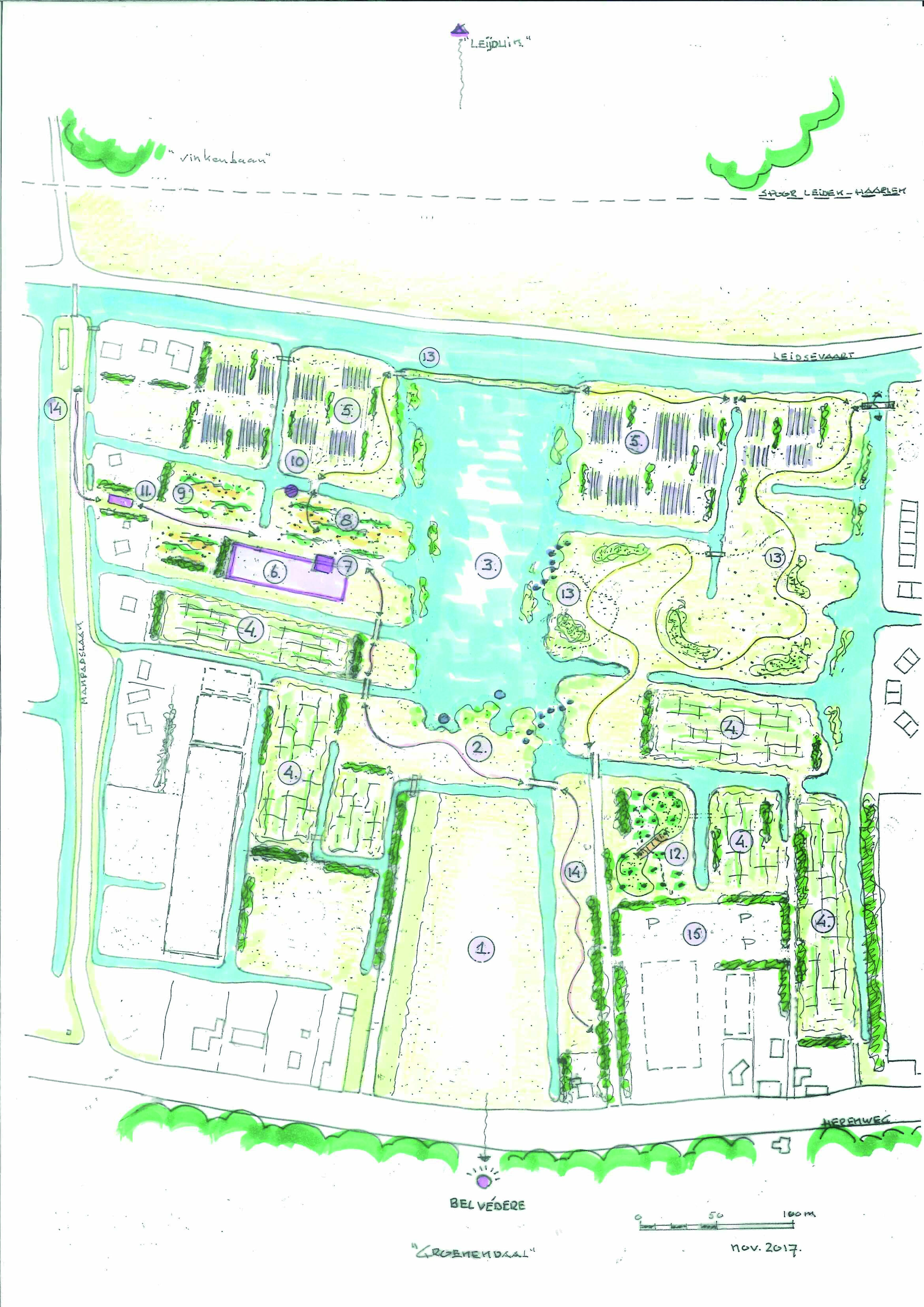 Om onze ideeën te verbeelden hebben we samen met landschapsontwerper Bart Hoes de schets natuurpark Manpadslaan laten maken. Deze schets is geen blauwdruk, maar een perspectief dat aangeeft wat er in onze ogen mogelijk zou kunnen. Het is een uitnodiging om met geïnteresseerde partners te werken aan een verdere invulling en uitwerking van ons plan.